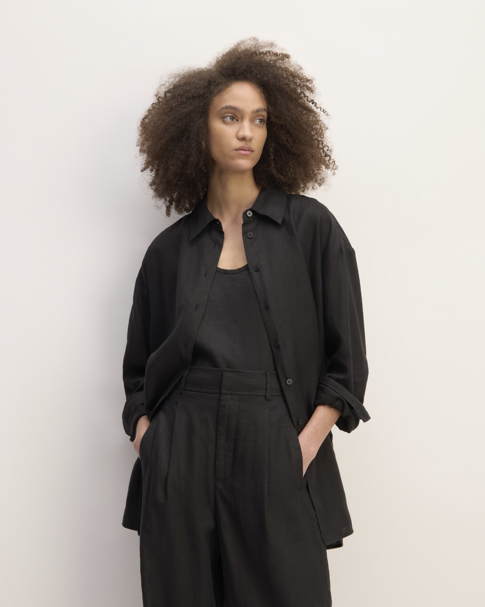 This piece features a relaxed oversized fit. shirt-tail hem with vent. cuff and sleeve button closure and back yoke.