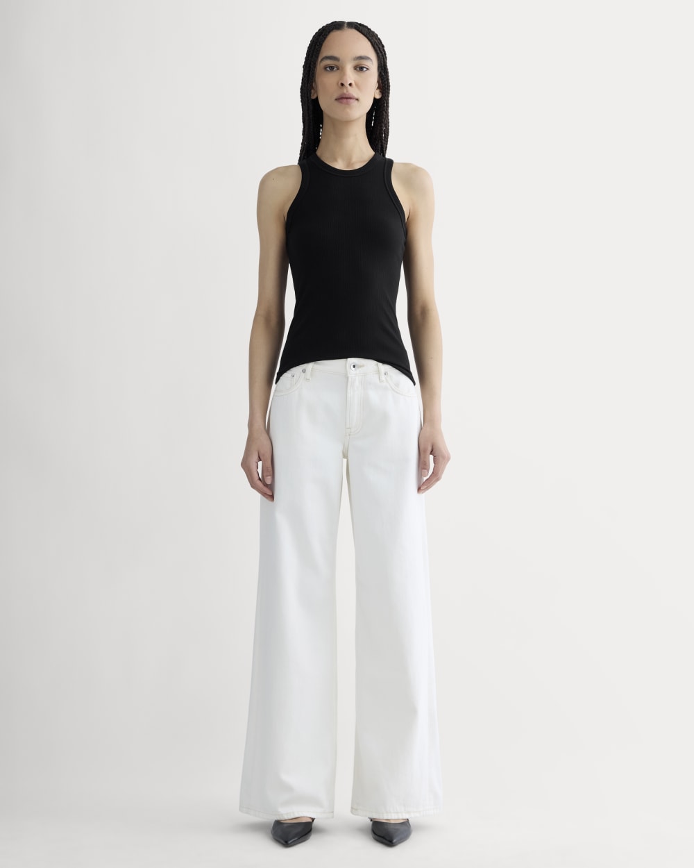 The perfect balance of sporty yet elevated. this tank features a crew neckline and racerback silhouette in a soft ribbed fabric with a subtle sheen. Channel ’90s minimalism with tailored black pants and barely-there sandals.