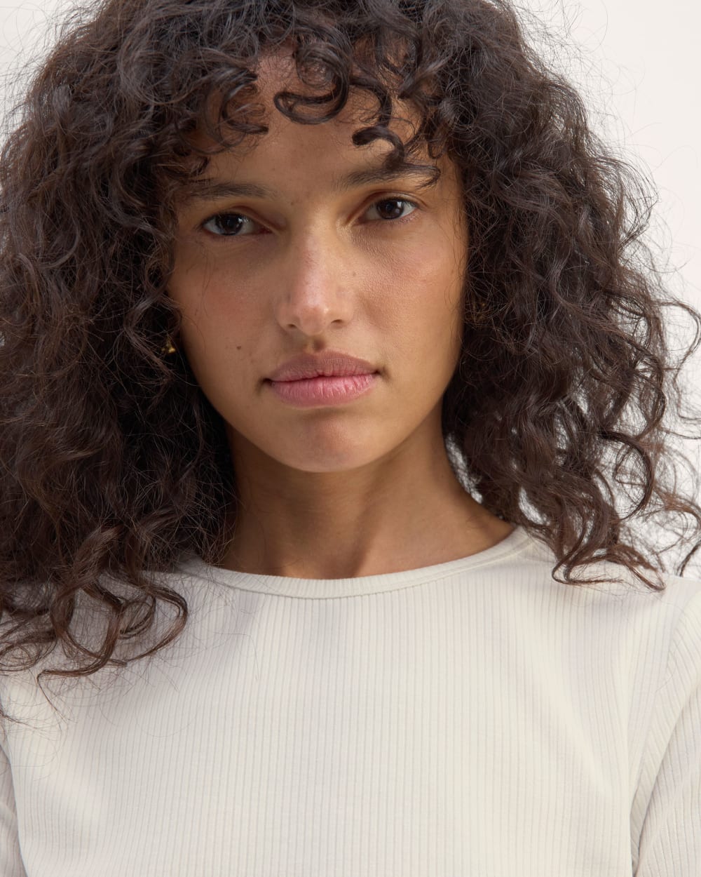 This piece features a crew neck. cropped silhouette. short sleeves. in our ribbed Shimmy fabric that offers an elevated softness and subtle sheen.